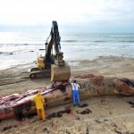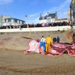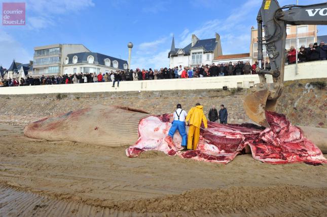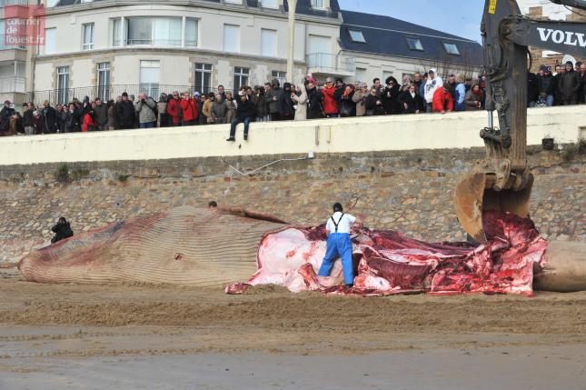 L’évènement a rapidement attiré les badauds et les curieux, il est vrai que les vendéens n’ont pas l’habitude voir ce type de visiteur s’échouer sur leurs plages. Les autorités ont donc rapidement organisé un périmètre de sécurité – notamment à cause des risque de propagation de bactéries – autour de la baleine qui est un rorqual selon les pompiers. Mais pas facile de déplacer un mammifère marin de 17 tonnes. Le découpage de l’animal a donc été vite organisé avant qu’il ne parte à l’équarrissage.